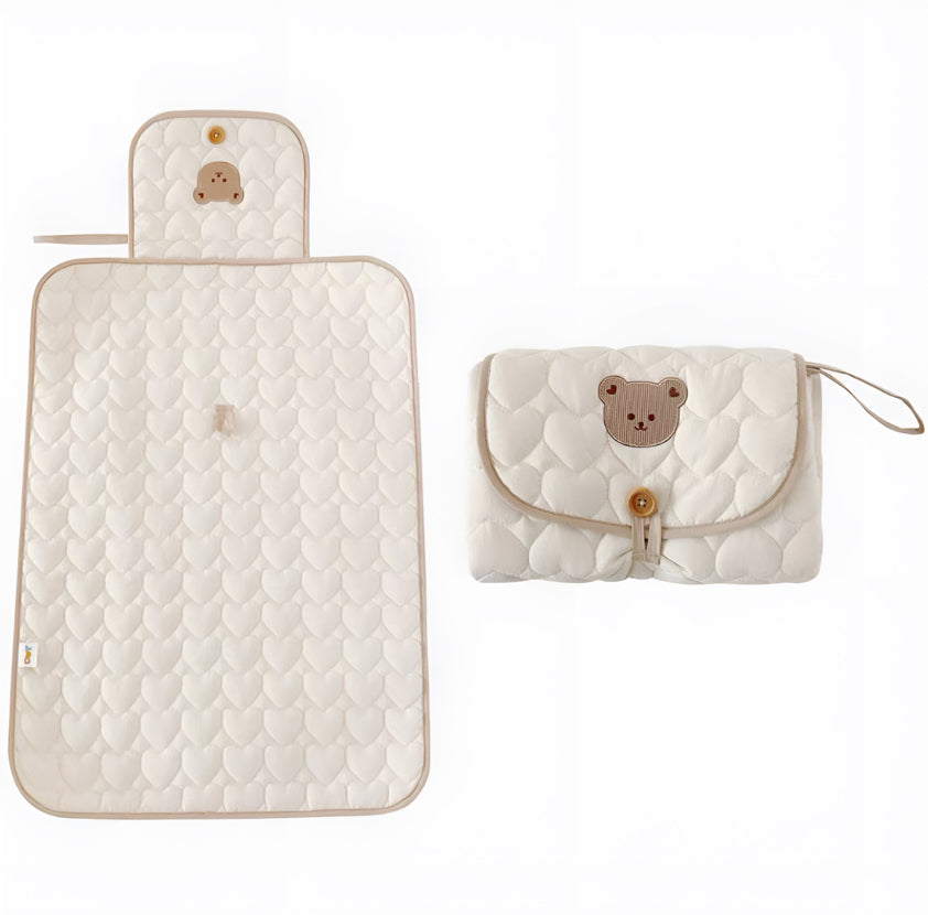 Changez bébé en toute sérénité avec ce tapis à langer pliable “Petit Ours”. Confectionné dans un tissu matelassé doux en forme de cœurs, il offre un confort optimal à votre tout-petit, que ce soit à la maison ou en déplacement. Facilement transportable grâce à son format compact et sa fermeture bouton, il allie hygiène, praticité et tendresse.